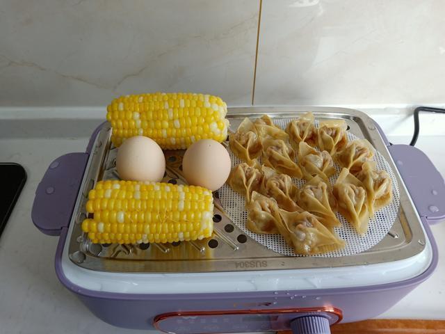 再放上蒸架,玉米、鸡蛋、馄饨一锅蒸。