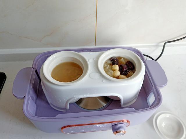 把炖盅连架子拿出来,盖上盖子,放旁边,陶瓷的保温效果很好呢。然后再放上接水盘,这个可以把蒸出来的脏水和下面干净的水分开,挺好的设计。