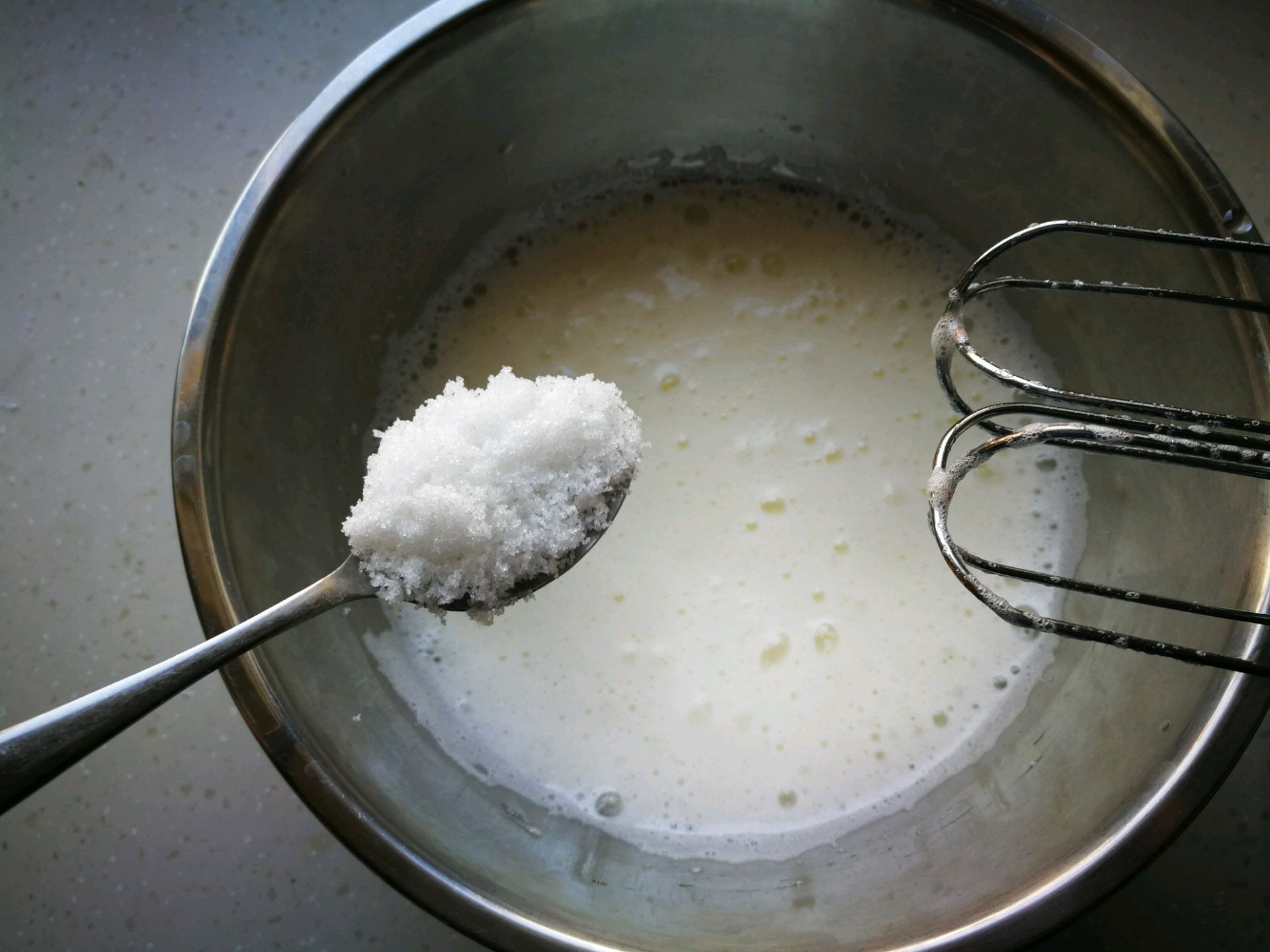 4、 加完了第2勺白砂糖的时候用电动打蛋器打发出有纹路的时候,再把剩下的白砂糖也下进去。